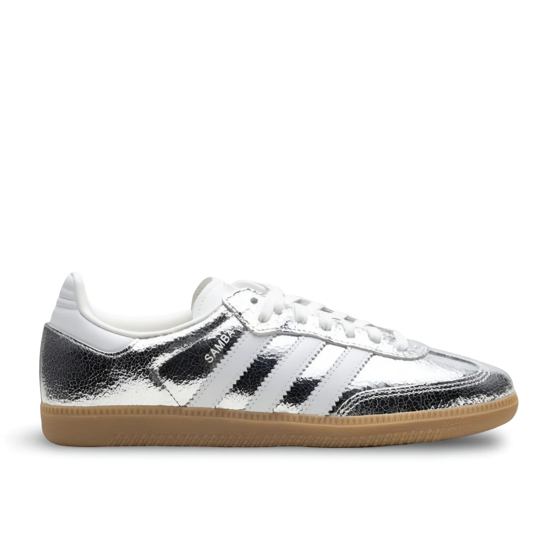 Step into iconic style with the Adidas Samba Metallic Silver sneakers. A modern twist on a timeless classic, this pair features a bold crackled metallic silver upper contrasted with crisp white leather 3-Stripes and heel tab. The shimmering finish adds a fashion-forward edge while staying true to the Samba’s heritage roots.