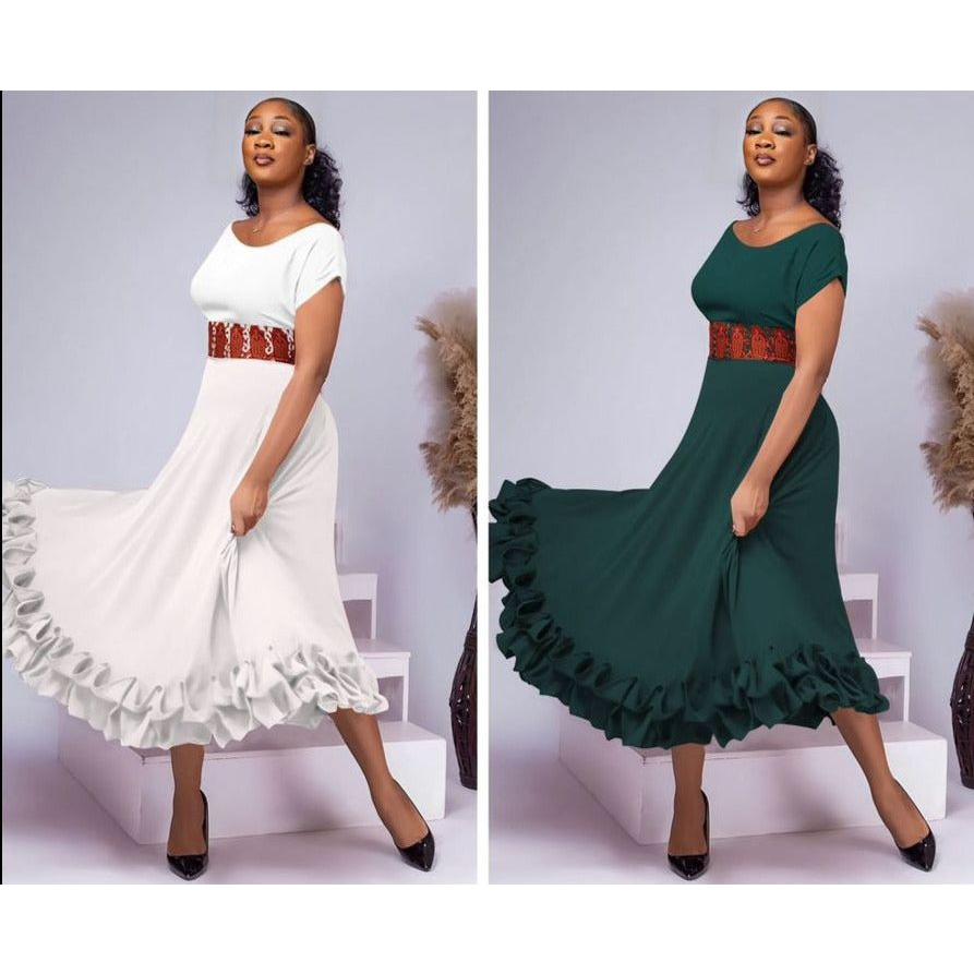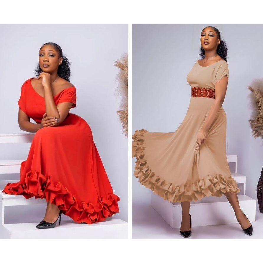 This stylish and modern dress features an elegant ruffled bottom, crafted from quality fabric for a fashionable and classy look. Its versatile design will add a touch of sophistication to any outfit.