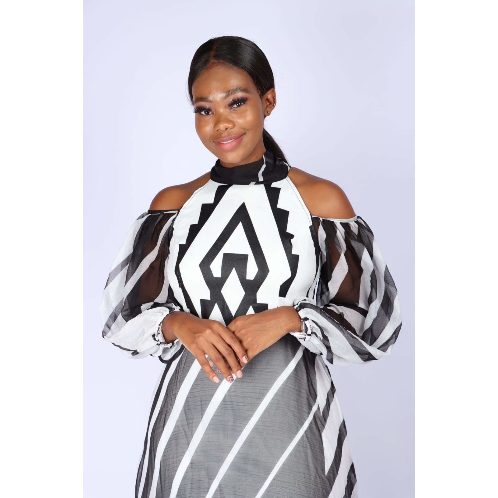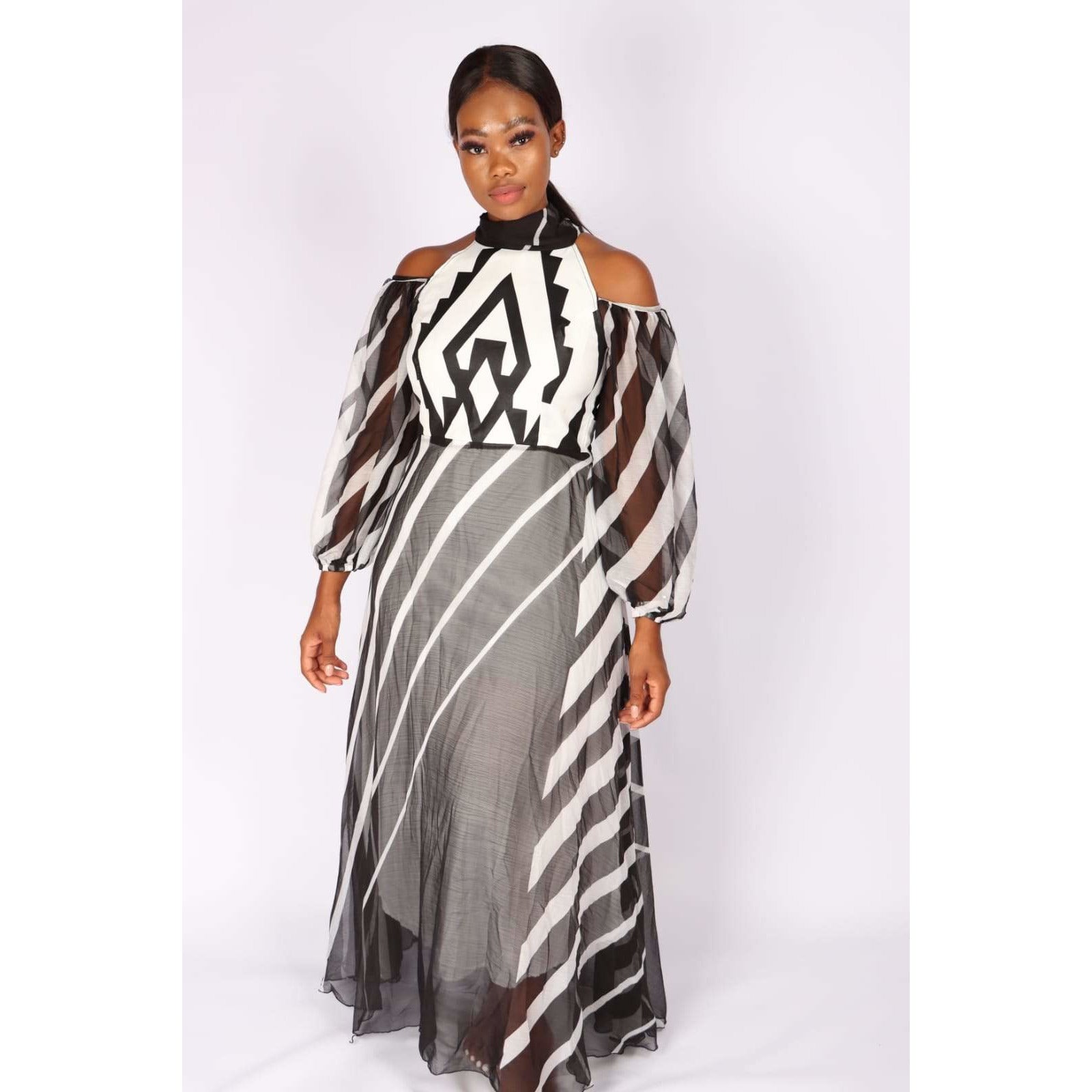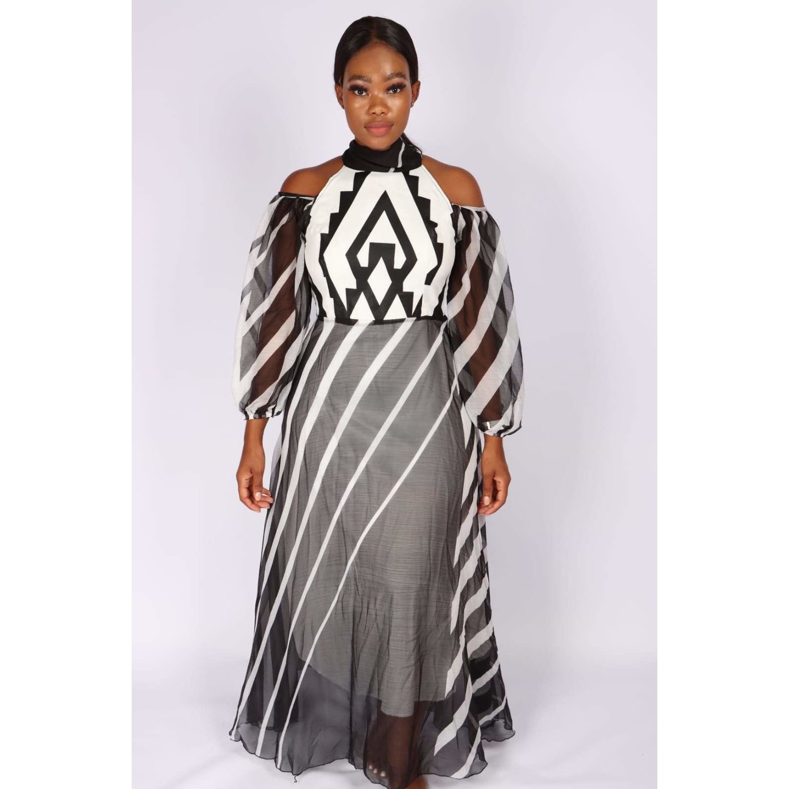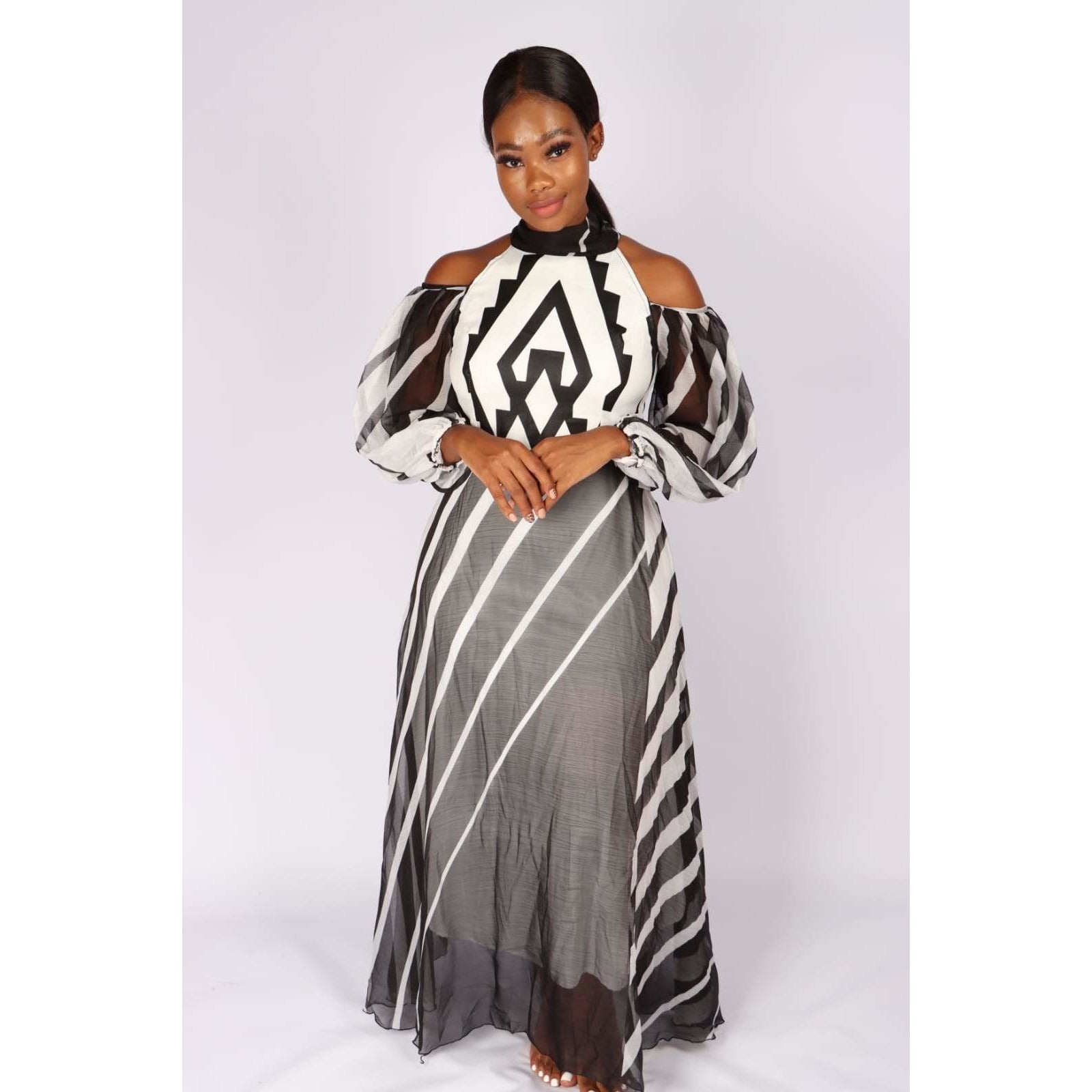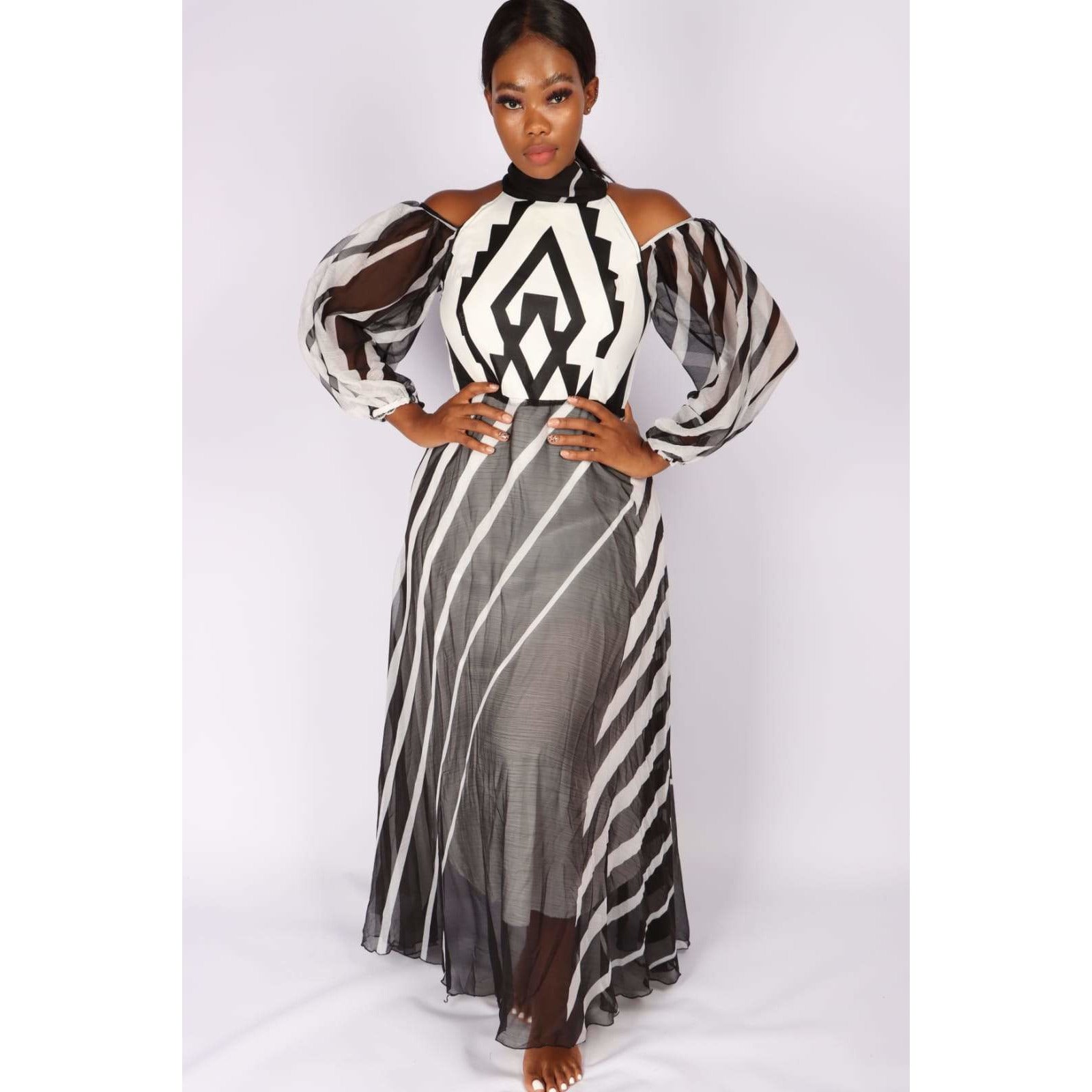 This elegant striped dress features an eye-catching cut off shoulder design. Long sleeves add a touch of sophistication, creating the perfect look for any special occasion. Crafted from premium materials, it is sure to make you look and feel fabulous.