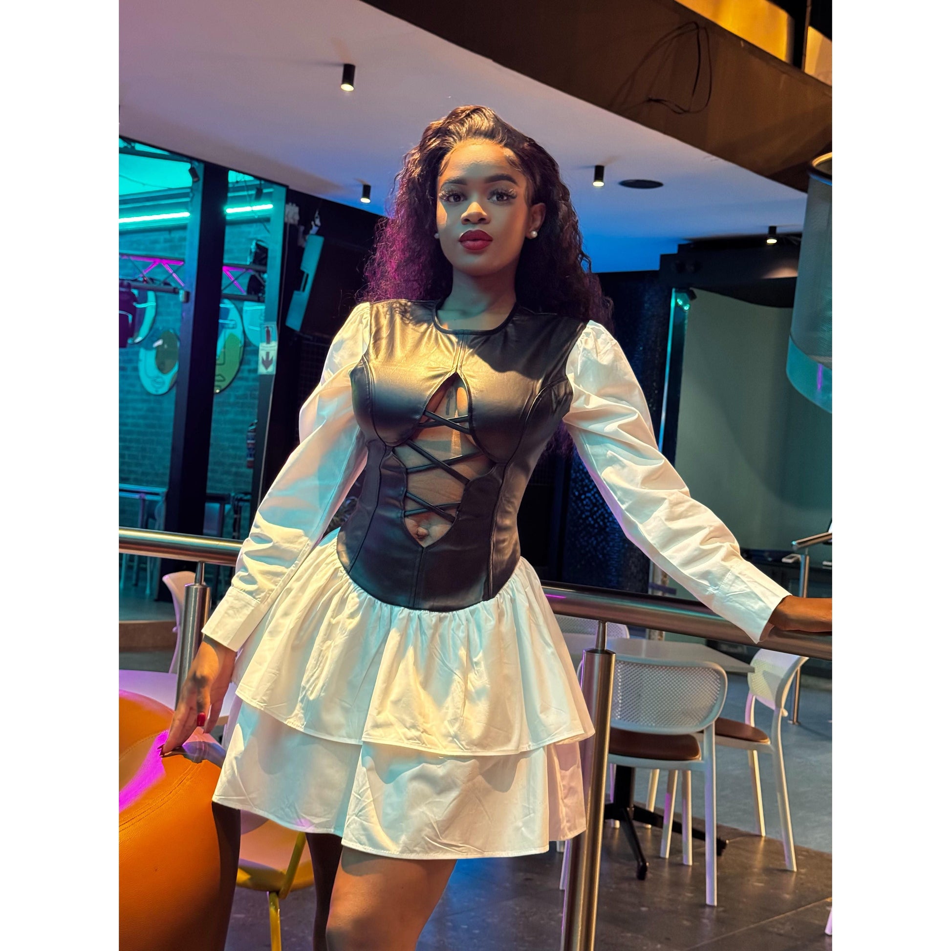Low-cut lace-up ruffle black leather dress This dress features a modern, stylish design that is perfect for any occasion. The low-cut and lace-up details add an edgy touch, while the ruffle accents give it a feminine flair. Made from high-quality black leather, this dress is durable and long-lasting, making it a great investment for your wardrobe.