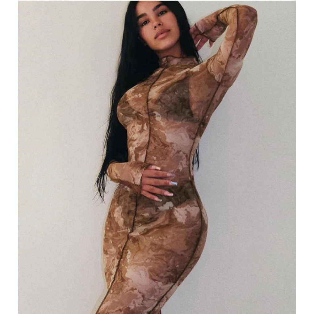This stylish bodycon dress features a unique mesh design for a modern, contemporary look. Its long sleeves and turtle neck provide versatility and coverage without compromising on style. The perfect way to show off your look without feeling exposed.