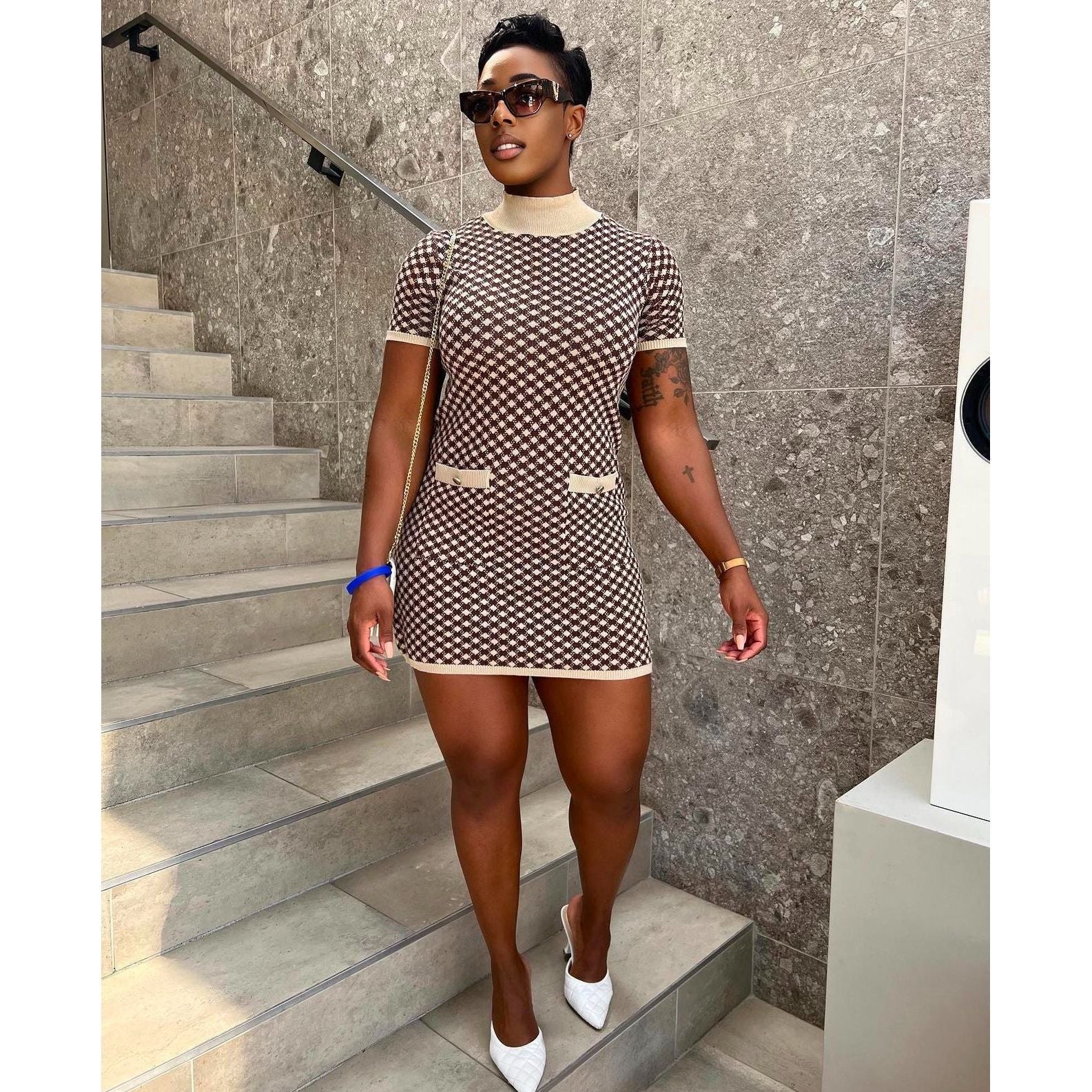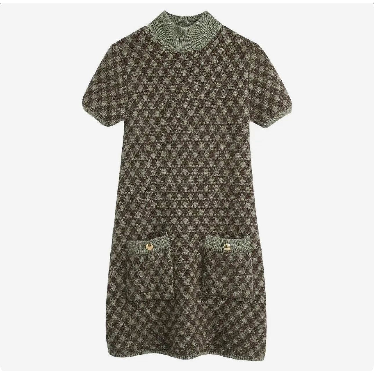 Mock-Neck Plaid Knit Mini A-Line Dress This dress is designed for style and comfort, with a flattering A-line cut and a warm, cozy knit fabric. It's the perfect combination of fashion and function, showcasing the latest trend of plaid without sacrificing comfort. Plus, the mock-neck design adds a touch of sophistication to any outfit.