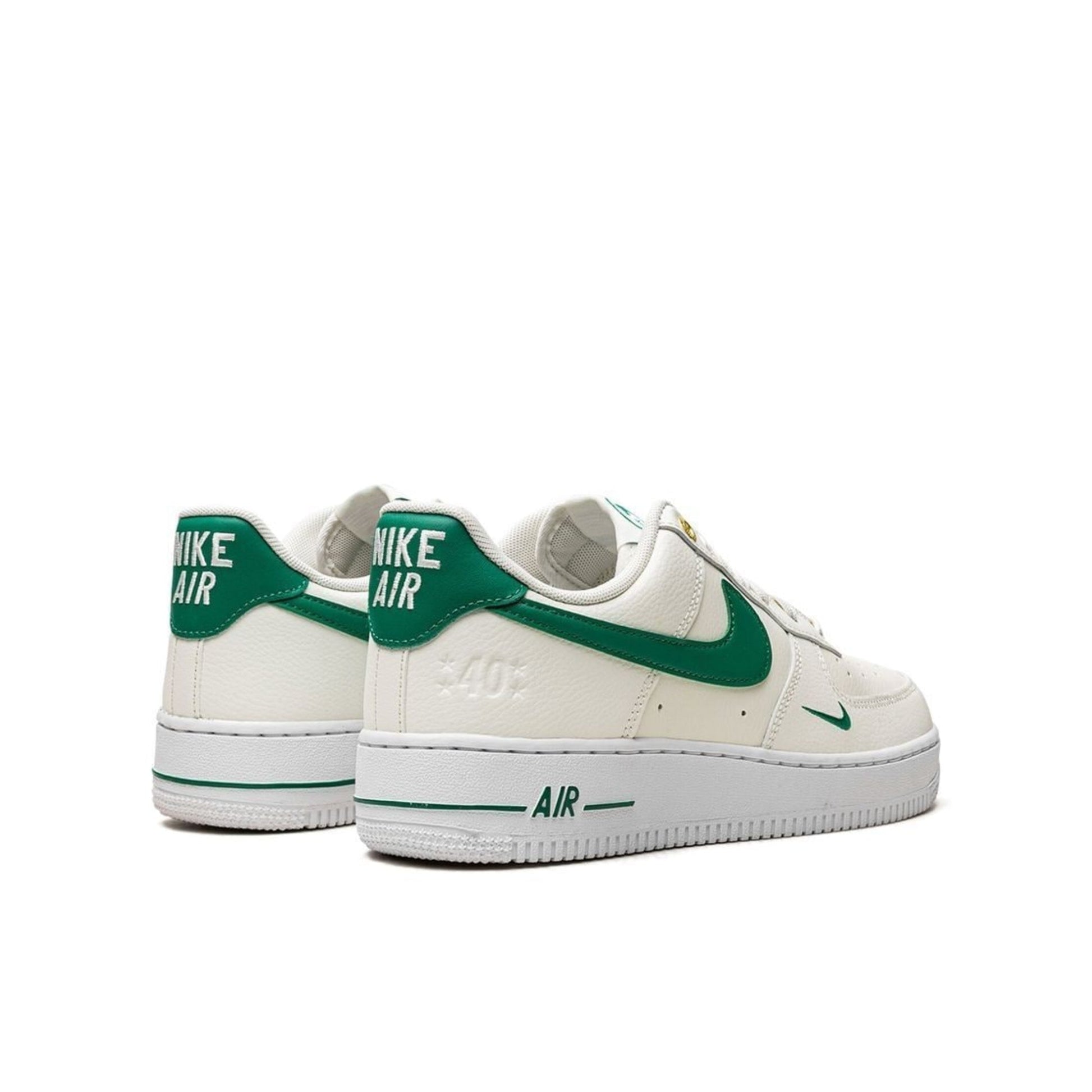 Nike celebrates the 40th anniversary of the Air Force 1 Low with this commemorative style. Featuring a classic “Sail” upper made with tumbled leather and “Malachite” details, this sneaker is presented in a timeless design that pays homage to its historic lineage. The heel counter sports a small embossed “40” surrounded with star icons and gold eyelets and lace dubrae add to the regal appeal. The insole of the shoe is marked with “82-22” for an additional nod to mark this special moment in time. A simple yet stylish style, the Nike Air Force 1 Low ’07 LV 8 40th Anniversary Sail Malachite sneaker will be an instant classic.