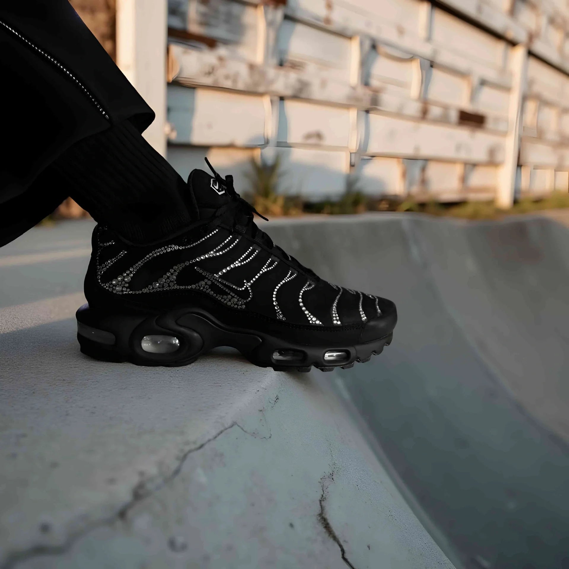 This exclusive design blends the bold, iconic lines of the Air Max Plus with the shimmering brilliance of Swarovski crystals, creating a look that's both fierce and refined. Featuring a sleek black base illuminated by reflective crystal detailing, the "Moonlight" edition captures the magic of a midnight sky. Built for style, comfort, and statement-making, it's more than a sneaker.