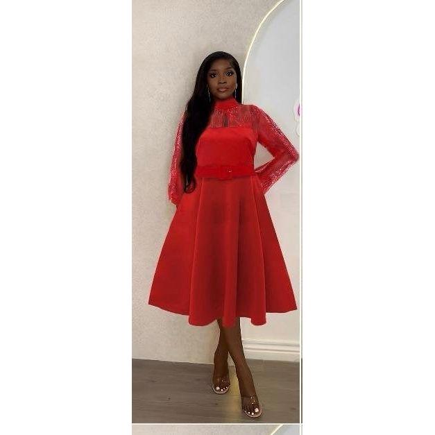 This dress features an elegant O-neck, intricate lace patchwork, and long sleeves, making it a versatile and stunning option for any party. With a flattering high waist and a classic A-line silhouette, this dress is designed to enhance your curves and provide a comfortable fit. The knee length hemline adds a touch of sophistication, making this dress a perfect choice for any formal event.
