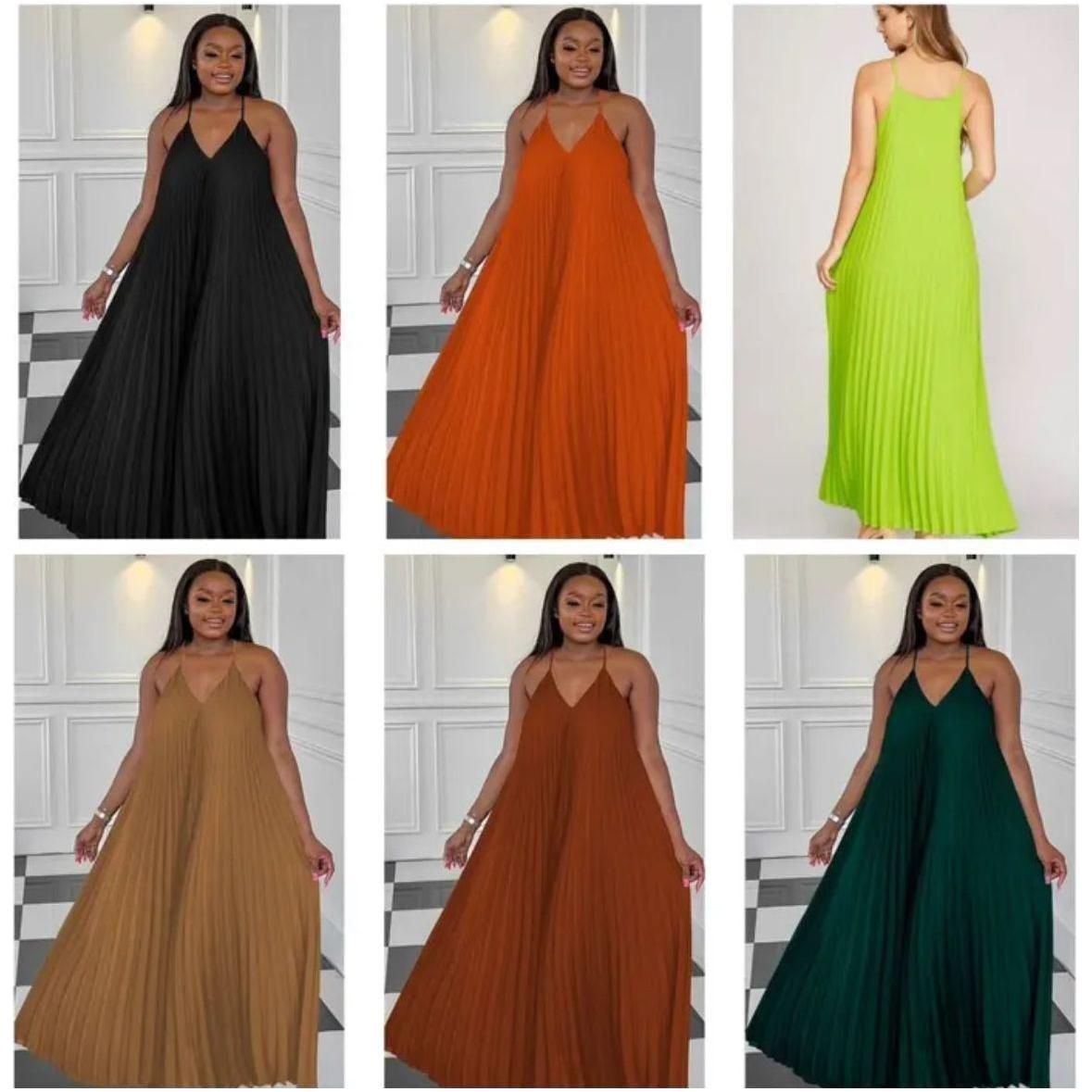 Pleated Sleeveless Midi V-neck Dress. This dress is designed with a pleated sleeveless style and a midi length, perfect for any occasion. The V-neck adds a touch of sophistication to the overall look.