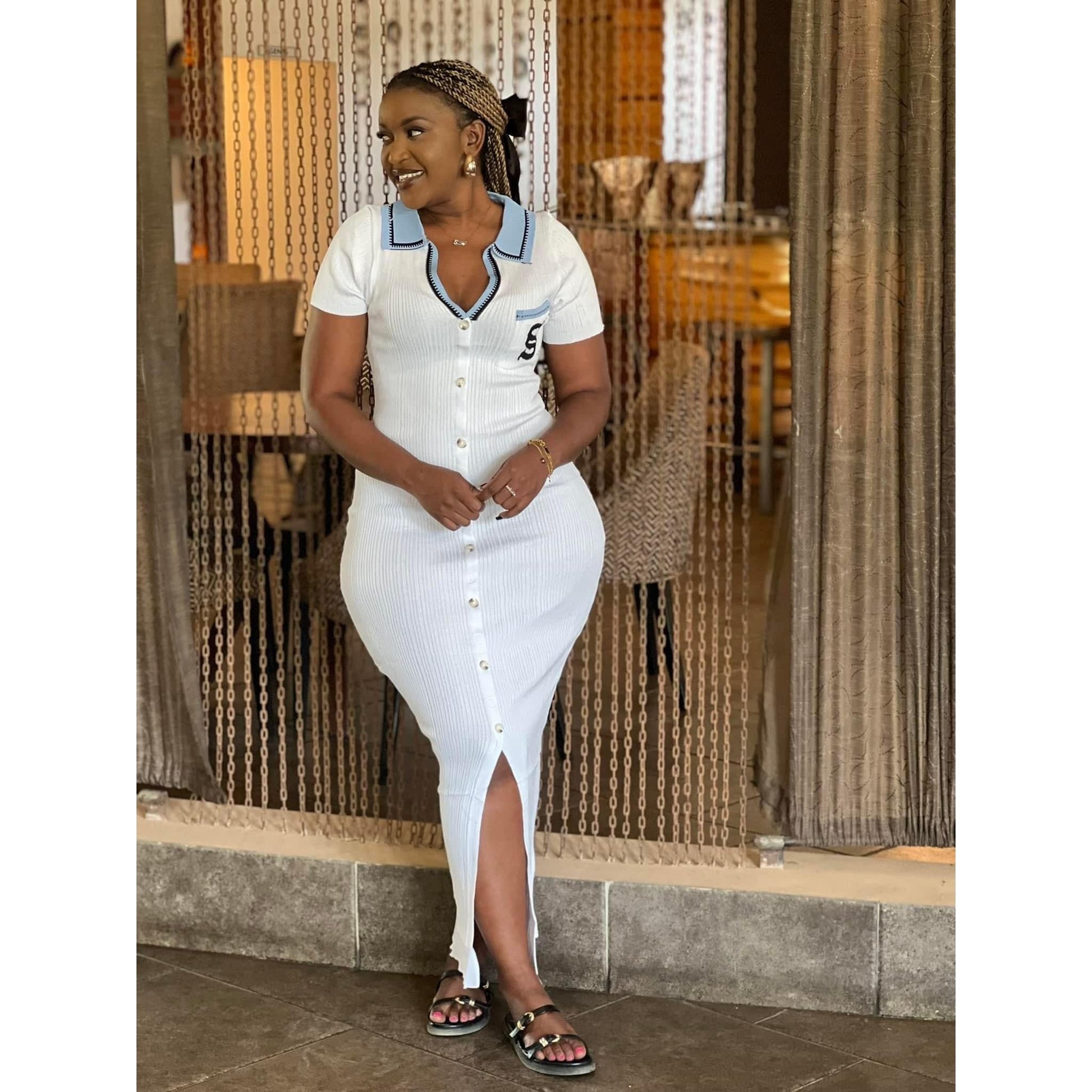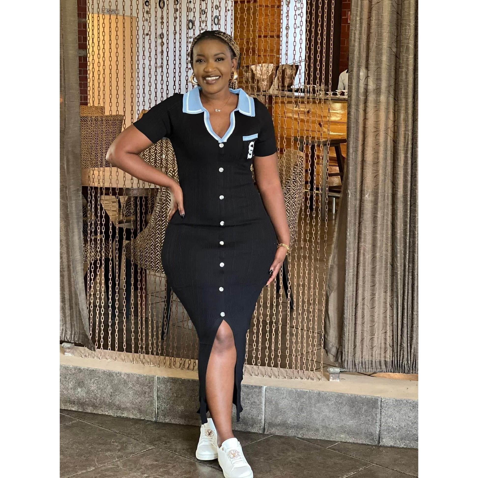 Ribbed Polo Midi Short Sleeve Dress. This dress is made with a ribbed fabric blend, providing comfortable stretch and a flattering silhouette. Perfect for a casual day out or dressed up for an elegant evening.