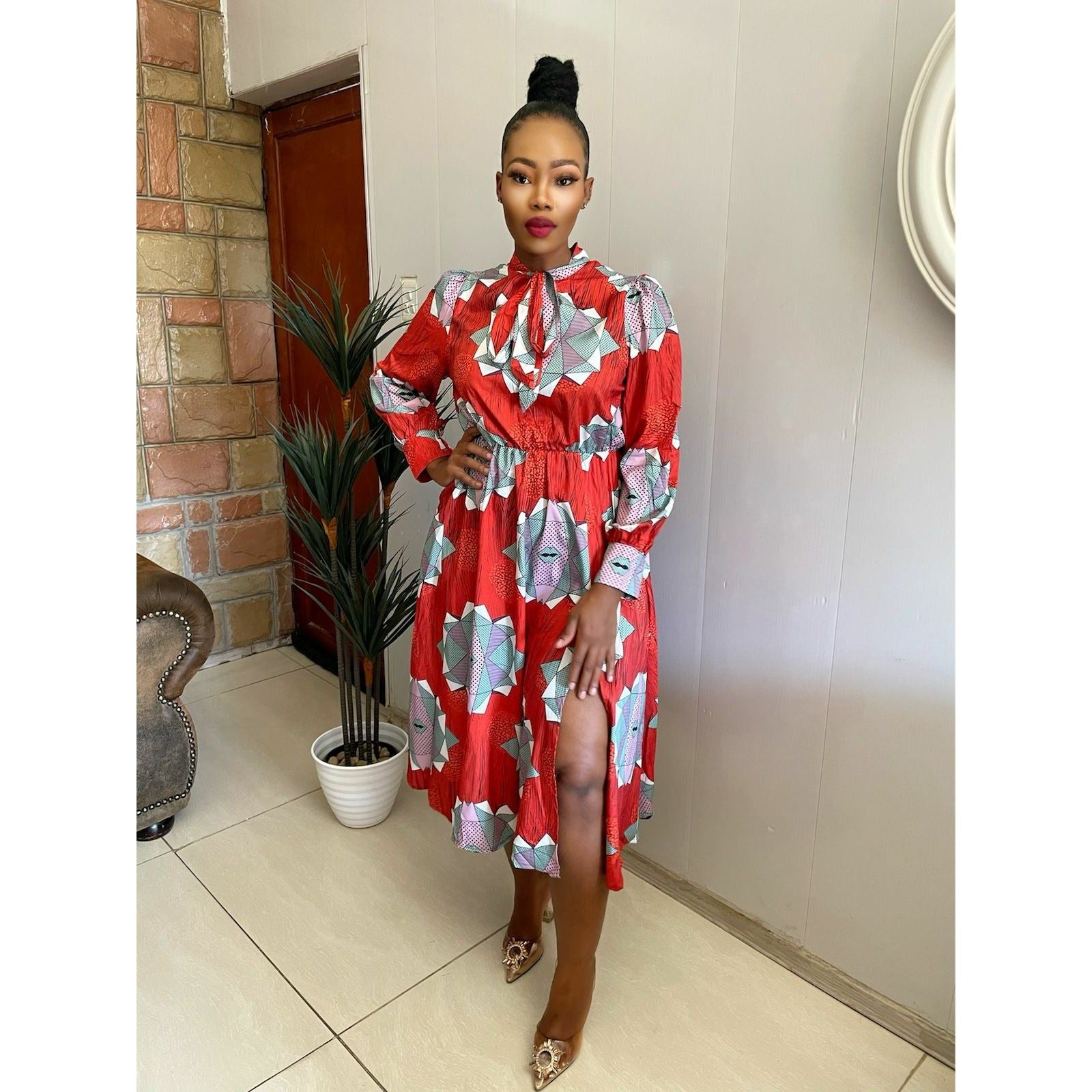This dress features a side slit and a floral pattern, making it both stylish and comfortable.