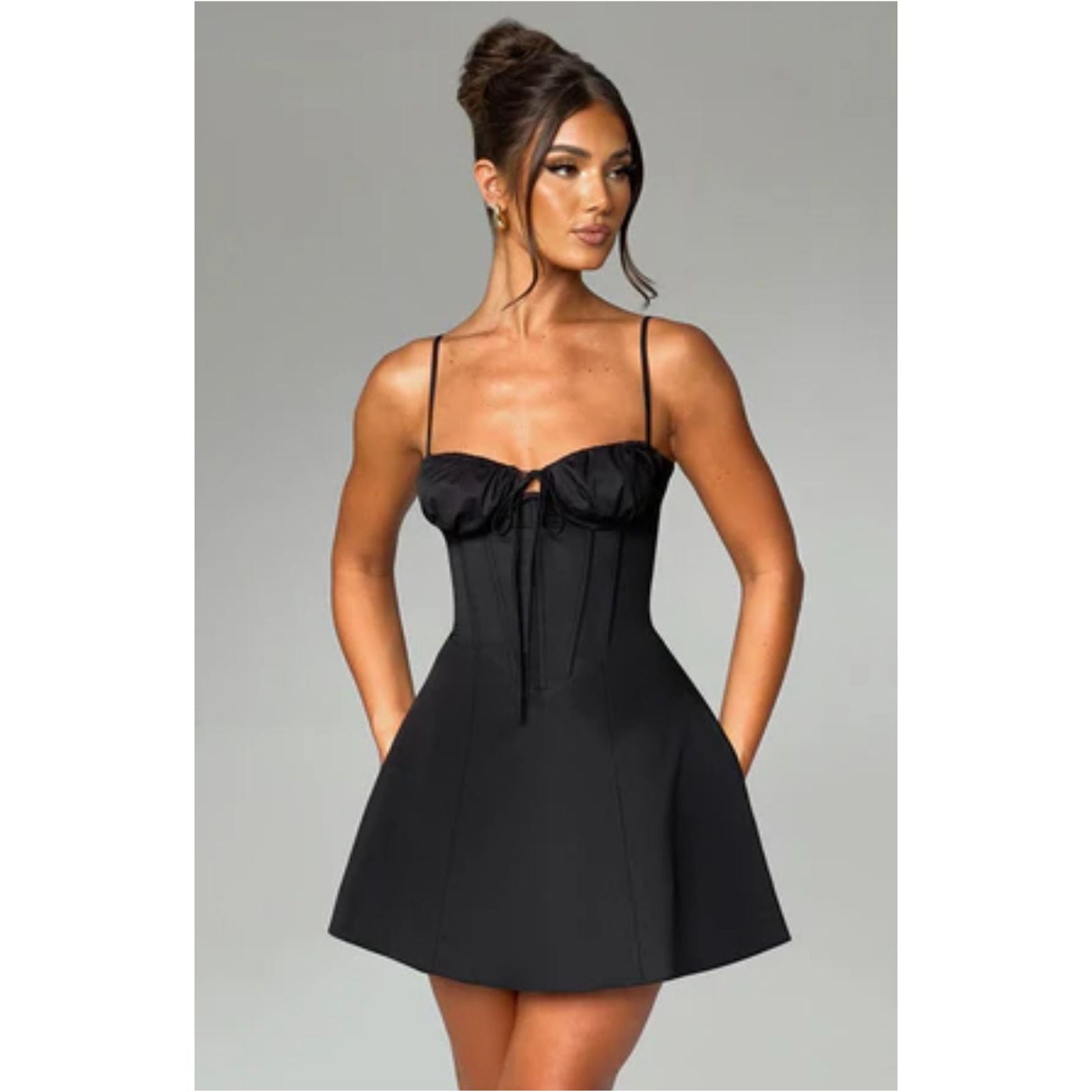 Perfect for any occasion, this sleeveless A-line mini dress boasts a low-cut design and a stylish tie-up feature. Its flattering spaghetti straps and ruched bodycon highlight your figure, making you stand out in the crowd.