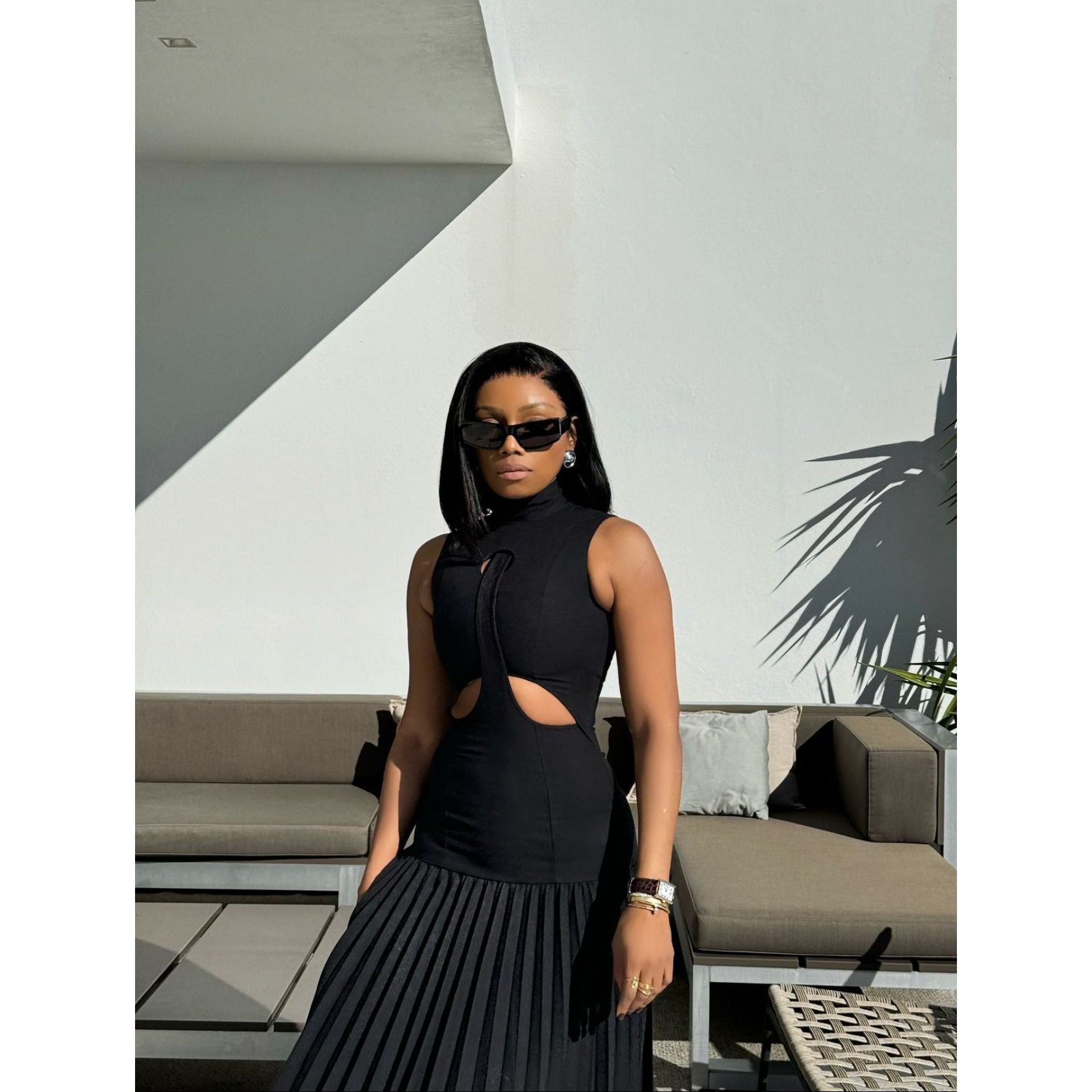 Sleeveless Pleated Flowy Maxi Elegant Cocktail Party Dress. With its stunning pleated design and flowy fit, our sleeveless maxi dress is the perfect choice for any elegant cocktail party. Expertly tailored for a flawless silhouette, our dress will make you feel confident and stylish at any event.