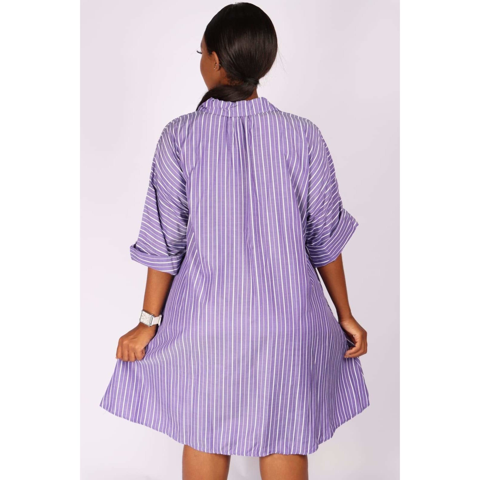 Experience style and comfort with our V-Neck Striped Bubble Shirt Dress. Made with high-quality materials, this dress features a unique v-neck design and a trendy striped pattern. Perfect for any occasion, it's versatile and perfect for everyday wear or dressing up for a special event. With its flattering fit and elegant style, you'll feel confident and chic wearing our V-Neck Striped Bubble Shirt Dress.